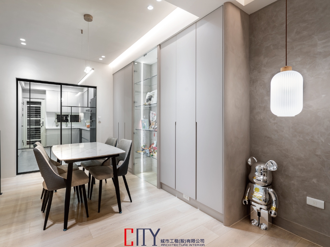 一樓可改為半開放工作區或玄關展示區,利用玻璃隔間保留光線。